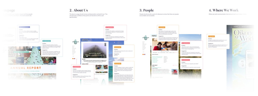 I proceeded to apply these heuristics to my analysis across all sections of the website. I identified problem areas and provided opportunities and suggestions for improvement.