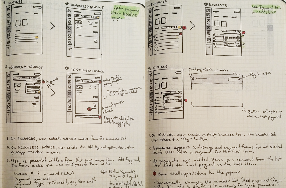 After reviewing key issues, goals and supporting research with my team's PM, I began sketching out key interactions.