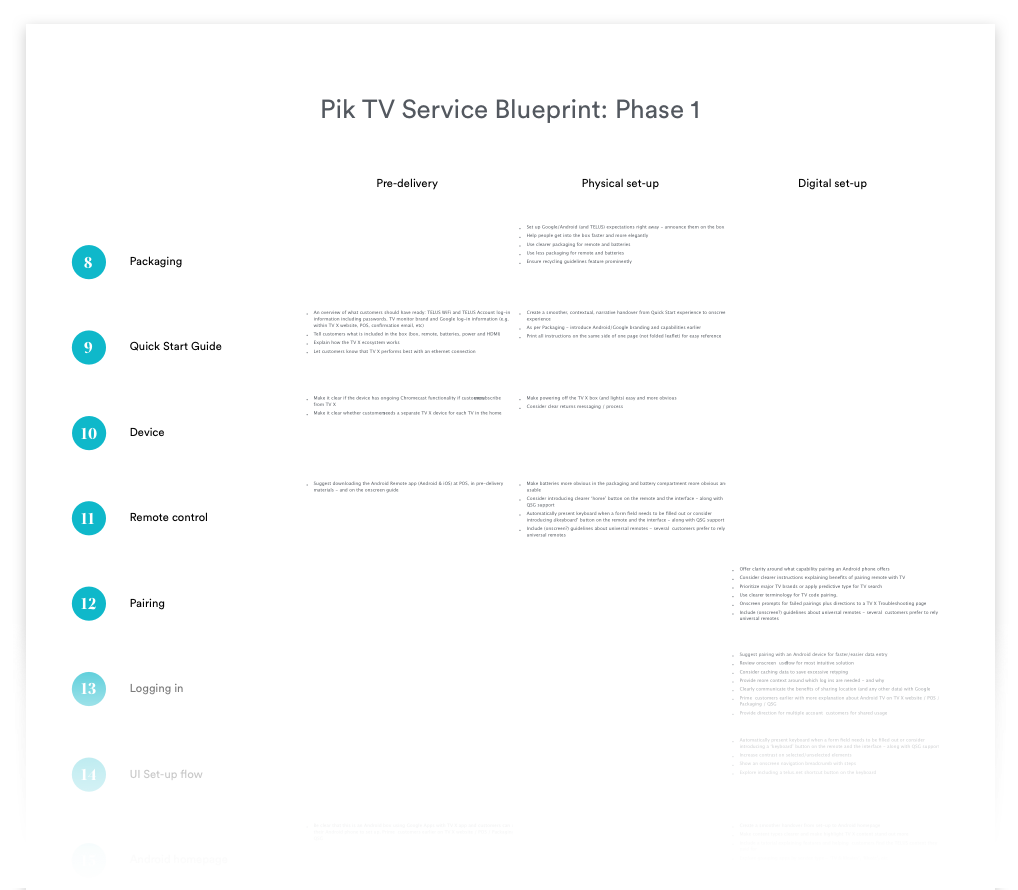 We worked collaboratively with key stakeholders and departmental representatives to map out the service in its entirety. The service had components that were web based (discovery and ordering), physical (unboxing and hardware) and TV based (media streaming UI). Taking this into account, we formulated a research plan that would leverage a suite of available technologies to allow us to capture and evaluate the complete service experience.