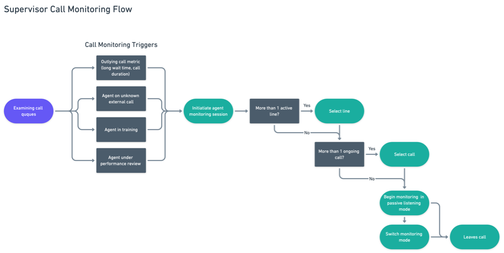 After interviewing call center supervisors and consulting with internal stakeholders, I mapped the call monitoring flow.